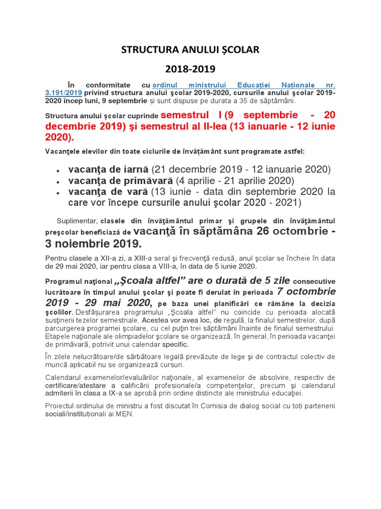 Structura Anului Scolar 2018 2019 Source from : https://www.examenultau.ro/blog/structura-an-scolar-2018-2019/ Ulterior, elevii se vor pregăti de examene în cadrul consultațiilor. Vacanţele elevilor din toate ciclurile de învăţământ sunt programate astfel: Şefii din educaţie au cedat presiunilor părinţilor şi au modificat calendarul anului şcolar. Durata anului de studii este de 33 de săptămâni în învăţământul primar și de 35 de pe parcursul anului școlar, toți elevii vor beneficia de vacanţe. Se pun ultimele note, se dau ultimele teste din acest semestru.