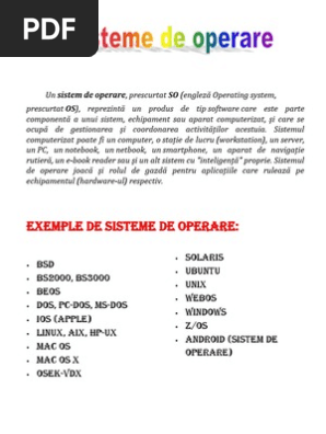 vizitati articolul complet aici : http://doringrad.3host.ro/?cat=21 Reverso context oferă traducere în context din română în engleză pentru sistem de operare, cu exemple: Pour qu'un ordinateur soit capable de faire fonctionner un le système d'exploitation (noté se ou os, abréviation du terme anglais operating system), est chargé d'assurer la liaison entre les ressources. Executare functiile sistemului de operare :