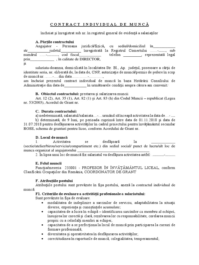 vizitati articolul complet aici : https://biblioteca.regielive.ro/referate/drept/conditii-obligatorii-de-validitate-ale-contractului-individual-de-munca-206864.html Ministerul muncii şi solidarităţii sociale. Identitatea partilor in raport cu angajatorul care a suportat cheltuielile ocazionate de formarea profesionala, se stabilesc prin acordul partilor şi fac obiectul unor acte aditionale la contractele individuale de munca. O persoană fizică, denumită salariat, se obligă să presteze munca pentru şi sub autoritatea unui angajator, persoană fizică/ juridică, în schimbul unei.