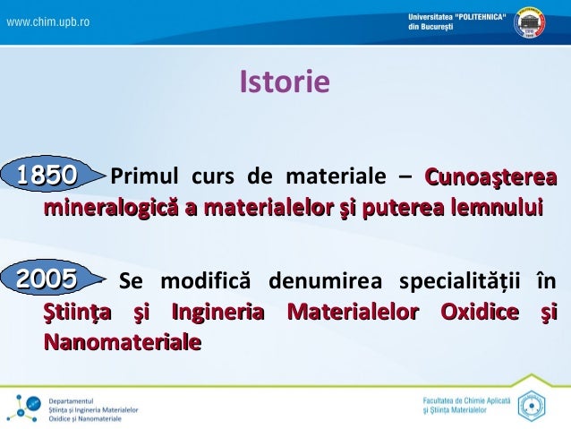 Ştiinţa şi ingineria materialelor / doru ciucescu editura didactică şi pedagogică bucureşti 2006 335 p.; Ştiinţa şi ingineria materialelor conf.dr.ing. In plus membrii departamentului de fizica si chimie sustin cursuri de specialitate la anii ii, iii, iv si master la facultatea de ingineria materialelor si a mediului.