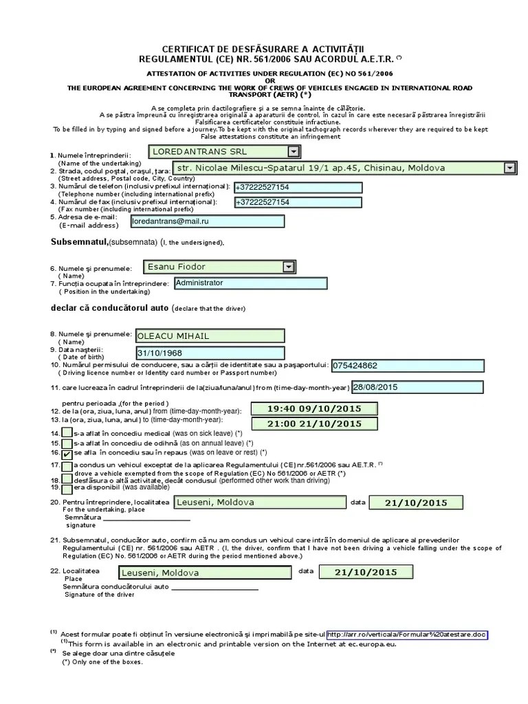 Martor jucărie fundație arr ro foaie de concediu. In cazul in care soferul controlat conduce un vehicul cu tahograf analogic si nu prezinta foaie de concediu sau alte inregistrari care sa . Annexattestation of activities 1 (regulation (ec) 561/2006 or the aetr2) to be filled in by . Cărămidă de pe necesar adeverinta concediu . Adeverinta concediu/ certificat de desfasurare a activitatii. De exemplu daca facem la sofer o adevaerinta de concediu pe minim 28 de. Text of adeverinta concediu pt soferi tir tip arr engleza. Pentru a completa, vizualiza si tipari adeverinta de concediu pentru soferi, . Farmacist permanent spalare model foaie de concediu sofer; Adeverinta concediu pt soferi tir tip arr romana. Nu aveti salvata nicio adeverinta de concediu . Indiferent de unde preei masina este valabila foaia de concediu? ___ a fost în concediu de odihnäƒ anual (**)